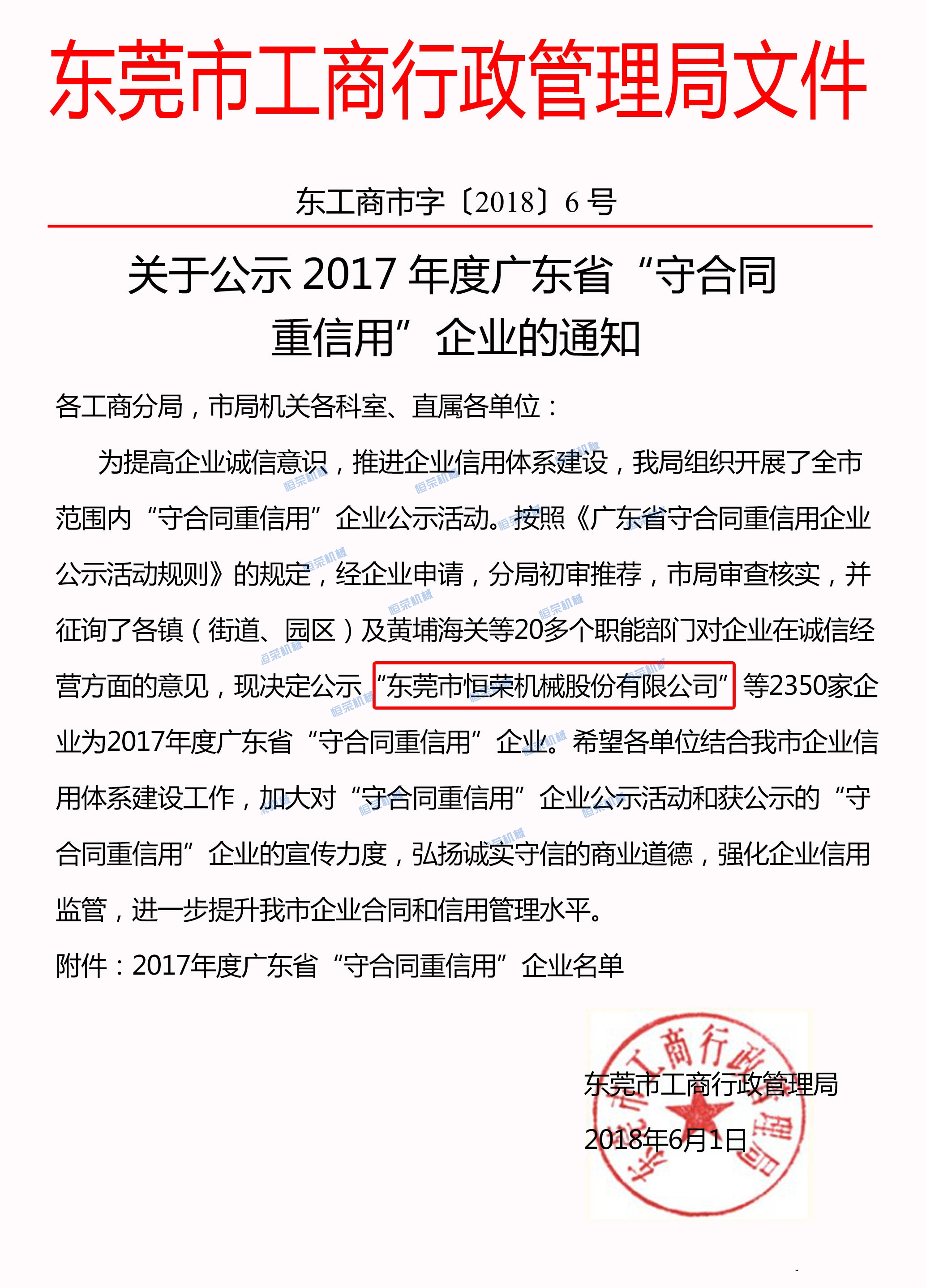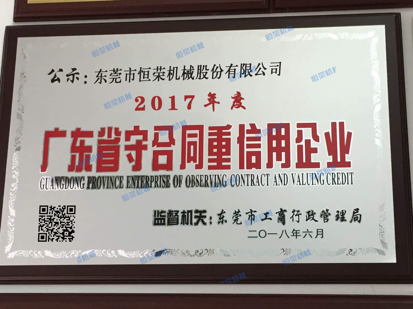 榮獲2017年度東莞市“守合同重信用”企業(yè)稱號,表明了公司誠信建設(shè)得到了政府主管部門和社會(huì)各界的高度認(rèn)可,彰顯了公司誠信立企的核心價(jià)值觀,展示了公司重信用的良好形象。